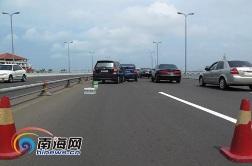 据排在前头的现代悦动车主介绍,当天上午9时50分许,她由龙昆北往海甸岛的方向行驶,刚上世纪大桥不久,突然看到桥面上放着三个事故锥筒,她赶紧刹车。“听说这三个事故障碍筒,是昨晚车祸交警处理完遗留下来的,怎么到早上还放着,不拿掉,这会给我们开车的人带来不便的。”