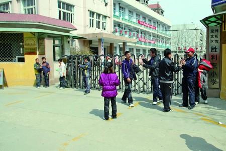 下午1:20在胜利东小学,校门外等待入校的学生已经有很多了。 本报记者 孙国祥 摄