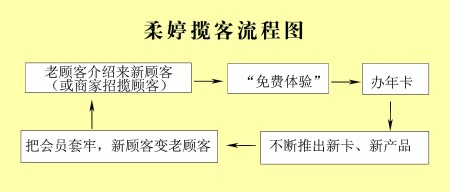 “听说过美容院能存钱吗?柔婷能。”尚钢俊也是柔婷的老顾客。2008年9月初,柔婷崇华店店长称,公司正在扩大经营,凡是在这儿存钱的顾客,交上一定的金额,不仅可以原本返还,同时还能自选享受其他项目和产品。