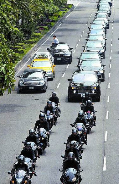 昨迎灵队伍由12辆黑色重型摩托车前导,36辆劳斯莱斯、奔驰、BMW等名车从丧宅出发,车队浩浩荡荡绵延逾一公里,引人侧目。