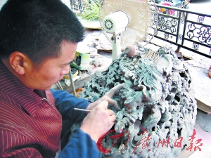 罗建泉惬意地坐在艺海端砚厂的产品展示厅内,喝着功夫茶,翻着专业书。这个三十多岁的男人似乎从出生的第一天起就注定了自己成人后的职业:制砚。往上数若干代,祖父、曾祖父……无一不是制砚师。在肇庆,有“罗、陈、蔡、郭”四大“制砚世家”,罗建泉是罗家的传人。