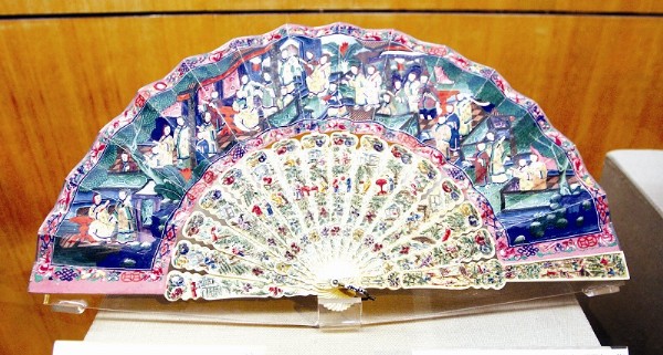 这是一把清中期的双面彩绘人物庭园图象牙扇,扇子上绘有清宫庭院图,反映宫廷人物故事。广东民间工艺博物馆副馆长黄海妍说,这把扇子与最普通的折扇大小相同,但双面却多达60个人物,而且这些人物脸部全是象牙贴绘的,扇面边则用杂宝、金钱、蝙蝠等图案修饰。由于扇面采用天然矿物质颜料绘画而成,所以画面保存至今仍色彩艳丽;此外,象牙扇骨雕柳亭人物,镂通细丝纹作地,并加彩绘描金处理。