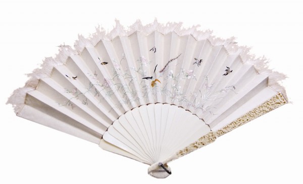此象牙扇以羽毛围饰,扇的大骨采用了深雕、浅雕、透雕等多种手法,雕有亭台楼阁、人物花草,小骨采用素身象牙片,简洁细腻。扇面装饰结合了广绣工艺,绣制的绚丽花朵与绿草相互辉映,双面都是蝴蝶、鸟雀在花草丛中追逐嬉耍,一片生机盎然的景象。特别的是,此扇还配有一精致的黑漆描金漆画扇盒。
