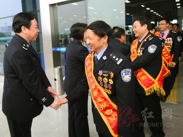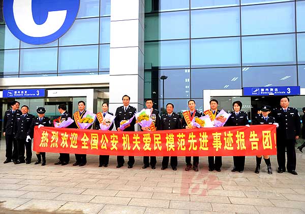 (3月31日上午,全国公安机关爱民模范先进事迹报告团抵达长沙黄花国际机场,受到热烈欢迎。)