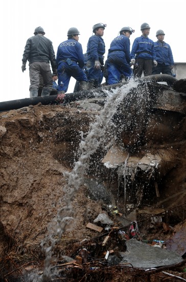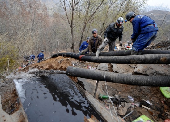 山西王家岭煤矿排水2万6千立方米未达计划进度 3月31日,一根出水管在向外排水。新华社记者 邢广利 摄