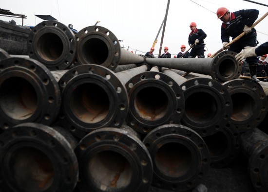 3月31日,抢险救援人员在搬运粗口径的排水管。新华社记者 燕雁 摄