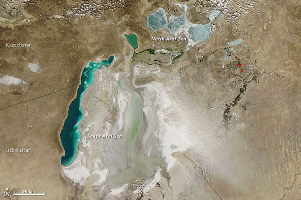 咸海曾经是世界上最大的内陆湖之一。但是,由于前苏联人于上世纪将大量的咸海海水用于农业灌溉项目,进入20世纪后半叶,咸海开始呈现戏剧性的快速萎缩。到21世纪初,咸海萎缩的进程仍在继续。随着水位的下降,咸海自然分成了南咸海和北咸海两片水域,而其中南咸海部分又进一步分成了东、西两部分。北咸海上的大坝起到了保持水位的作用,但是南咸海上同样的大坝却导致了水位的持续下降。在本图中,北咸海表面呈现斑驳的亮白色,那是因为水面之上覆盖一层薄冰,进入春季后仍未完全融化。