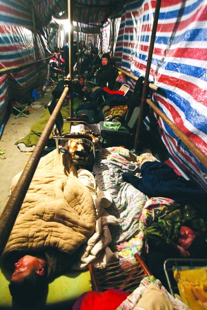 5日晚10时30分,为了占位置,房主雇人排队值夜班。本报记者杨宁摄