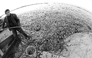 当地一位农民在团结水库堤岸边打捞死鱼。辽宁省沈阳市郊区团结水库被严重污染,过去的清水如今已是浑浊的黑水,密密麻麻的死鱼漂浮在水库的南堤岸边,形成一条2公里长、近两米宽的“银带”。辽宁省、沈阳市环保部门目前已先后赶到事发现场作进一步调查。辽宁省环保部门7日做出的环境应急监测数据显示,沈阳市团结水库被严重污染的水体COD含量为每升水84毫克,超标近3倍。目前水库闸门已关闭,但仍然通过溢洪口向外放水。远在30多公里以外的辽中县城居民反映,当地新建的景观河的水已经开始有臭味了。新华社发