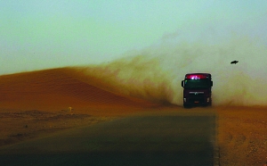 ■3月29日,阿拉善左旗吉兰泰镇沙尘飞舞,一辆卡车驶过把公路覆盖的沙丘