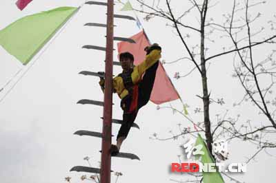 (苗家神功绝技大师田如平的弟子在表演上刀梯。)
