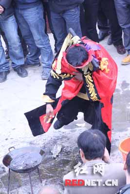 (苗家神功绝技大师田如平表演“下油锅”,赤手空拳从油锅里捞出炸熟的活鱼。)