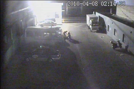 监控录像显示,有两人隐身在一辆面包车背后,久久不出现。随即警方出动抓获嫌疑人。