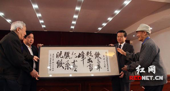 会上,原四十七军老战士崔文跃、张健、张绍进还代表原四十七军老战士,分别向县委、县政府赠送了撰写着“铁马军歌出雪峰、六十老骥系沅陵”的匾牌及反映原47军军史、战斗史的书籍。