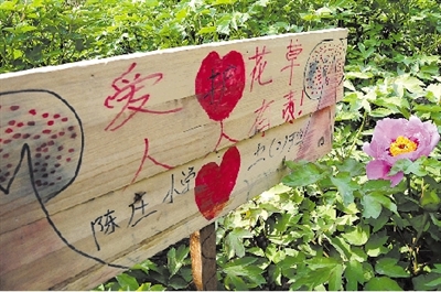 “我们园中的牡丹花,今天早上7点左右开了第一朵,附近小学生自己制作了很多护花牌,来提醒游客文明看花。”昨日上午,西流湖公园管理处工作人员向本报来电,他们想通过本报提醒市民,如果没时间去洛阳看牡丹,可到他们园内免费观赏牡丹。