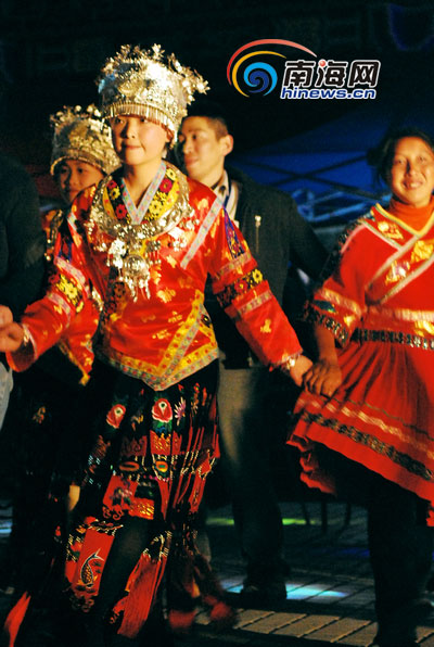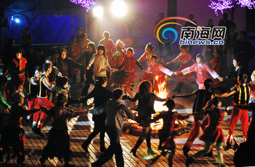 篝火晚会上,游客与少数民族兄弟牵手共舞。(南海网记者邓宇摄)