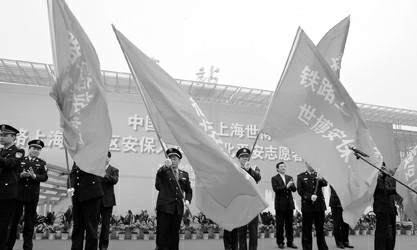 图为安保队伍的红旗在铁路上海站飘扬。本报讯(记者徐亢美)昨天上午9时,铁路上海站南广场举行了上海世博会铁路上海站地区安保人员宣誓仪式。在世博会举办期间,共有2500名世博安保人员值守在这一地区。