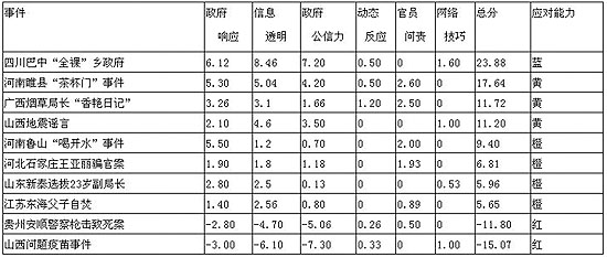 据了解,人民网舆情监测室梳理的2010年第一季度十件“舆情热点事件”,仍旧按照“政府响应、信息透明度、政府公信力”3个常规指标,以及“动态反应、官员问责、网络技巧”3个特殊指标,对地方政府应对、处置能力做出评估。