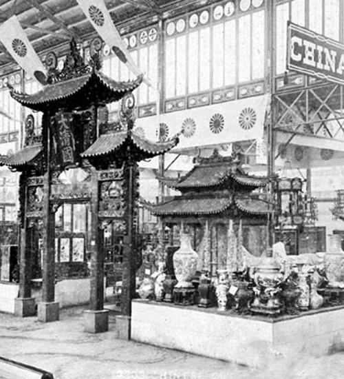 1876年美国费城世博会中国展区的情况。从这届世博会开始,组委会允许各国设立独立展馆,逐步取代了原来的主题展馆