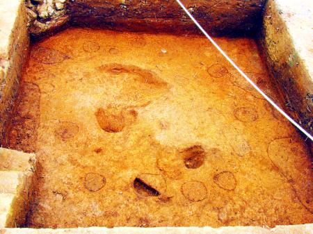 探方里隐约可见的柱洞痕迹,这些柱洞围成一圈就是古人房间的大小