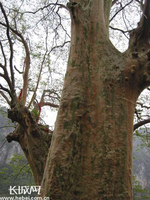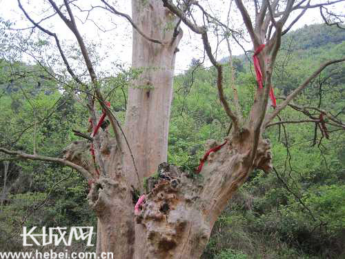 远远望去,“神树”苍劲挺拔,充满蓬勃生机,此树奇特之处在于一年开花三次,脱皮一次,籽不发芽,根不繁殖、嫁接,杆插都不繁衍,唯此独存,当地政府为了发展旅游,已在神树处建成保园。