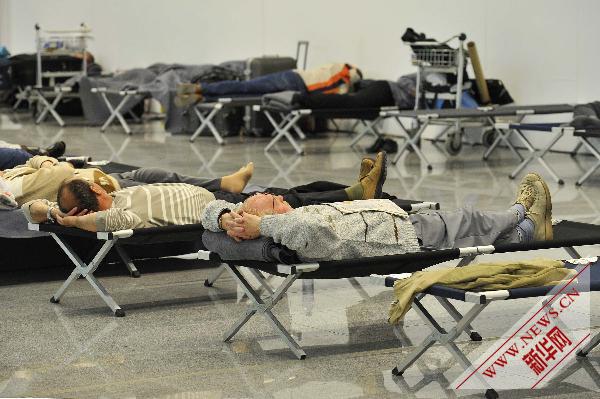 | 4月16日,因航班取消而滞留的旅客在比利时首都布鲁塞尔国际机场休息。新华社记者武巍摄 |