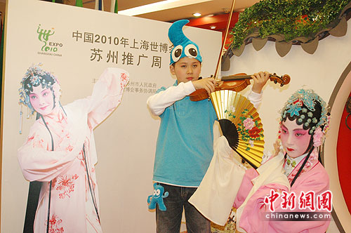 中新网苏州4月17日电(赵龙)16日,在上海淮海中路新世界广场,拉着小提琴的“海宝”和昆曲小“杜丽娘”的一同惊艳亮相,拉开了上海世博会“苏州推广周”的序幕。