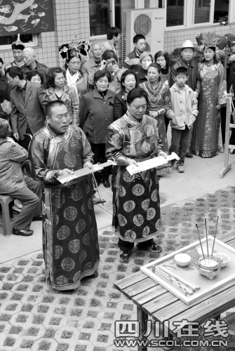 昨日,族长赵尔劲穿上蓝色镶金边、上有盘龙的满族服装,召集200余名居住在成都的伊尔根觉罗家族后人,在高朋大道12号举行了一场盛大的祭祖仪式。