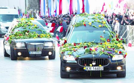 4月18日,在波兰南部城市克拉科夫,运送已故总统卡钦斯基及其夫人灵柩的汽车驶过大街。汽车上撒满了前来送行的市民们撒的鲜花。 新华/法新
