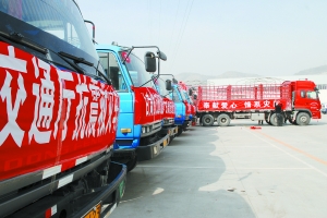 本报讯(记者田玥 实习生王拓)4月18日上午10时,18辆大型货运车从省道路运输应急救援保障中心驶出,前往玉树地震灾区。据悉,这些货运车是省公路运输管理局应青海交通运输部门发出的抗震救灾货运车辆支援请求,连夜从兰州、定西、白银、临夏等地调集的,主要承担西宁市至玉树的救灾帐篷转运任务。