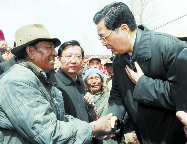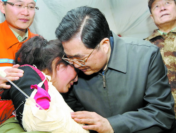 4月14日,青海玉树发生7.1级地震后,正在国外访问的胡锦涛心急如焚,他说:“在这一困难时刻,我需要尽快赶回国内,同我国人民在一起。”17日下午,提前结束访问行程的胡锦涛回京后当即主持召开中共中央政治局常委会会议,全面部署当前青海玉树抗震救灾工作。18日,他又风尘仆仆飞抵玉树,看望慰问灾区干部群众,实地指导抗震救灾工作。