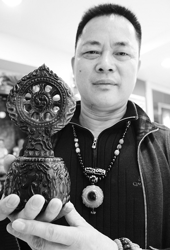 “我以前是做餐饮业的,整天想的都是葱姜蒜那点事,对天珠什么的根本就一无所知,能做到现在这样,完全是个偶然。”回忆起结缘天珠的经历,巫英托说这完全是因为他的大女儿的一个灵感。