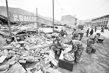 据介绍,目前整个震区被划分为19个区域,由19支专业搜救队进行网格式搜索、救援。但因为玉树地处高寒低温地区,在恶劣的自然条件下,被埋者能够生存的可能性已极其微小。目前搜救队的主要工作是挖掘遗体,以防止在天气转暖后发生疫情。