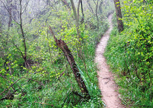 记者分别沿着三条野道往下进入密林中,由于雨后野道十分湿滑,两侧到处是荆棘,行走十分困难。不过在密林中可见到多处折断的荆条,以及被踩踏过的痕迹,而且被折的枝条是新断的。在密林深处有一处略微平坦的地方,地面的草及纸条显得凌乱,也许是夜雨的冲刷,记者没有看到血迹。