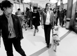 沈阳盲人田女士从大连领回一只导盲犬 hedy能带田女士逛超市 别人给东西都不吃