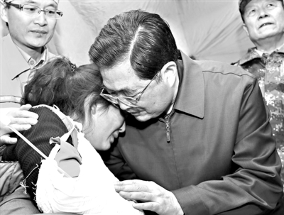 地震无情,人间有爱。党中央和灾区群众心连心。玉树强烈地震发生后,正在国外访问的胡锦涛总书记对灾区群众万分牵挂,第一时间就对做好抢险救灾工作作出重要指示,并当即决定提前结束访问回国。17日14时20分许,经过近25个小时长途飞行后,胡锦涛总书记从大洋彼岸回到北京。当天16时,总书记不顾旅途劳累,立即主持召开中央政治局常务委员会会议,听取抗震救灾工作汇报,研究部署下一步抗震救灾工作。18日一大早,总书记就立即乘飞机赶赴抗震救灾第一线。