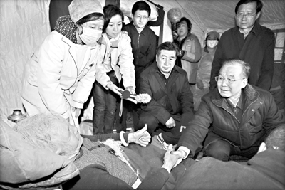 在一顶帐篷里,温家宝蹲下身来,嘘寒问暖,查看伤员伤情,安慰悲伤的群众。40多岁的珠玛才仁家里三口人被地震夺去生命,还有三口人受伤严重被送往西宁救治,她悲痛欲绝。温家宝紧紧握住她的手安慰道:“我们一起悼念失去生命的亲人吧,过段时间按照你们的习俗安葬他们。转到西宁救治的亲人我们一定会千方百计治疗好,等他们病好了请你去西宁看他们。”总理的眼里含着泪水。