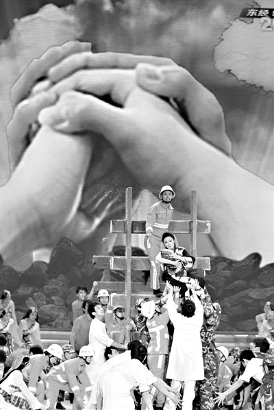 20日,“情系玉树、大爱无疆”震灾晚会中表现抗震救灾的场景。(均据新华社发)