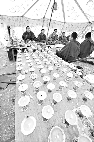 17日,僧侣在玉树县结古镇民主路一处“帐篷佛堂”内为地震遇难者和受灾群众祈祷。