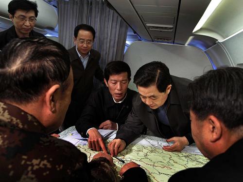 第二天上午8时,在飞往灾区的专机上,胡锦涛把随行的有关方面负责同志召集到一起,详细询问玉树抗震救灾最新情况,讨论研究具体办法对策。他指示随行的中央军委副主席郭伯雄,当前部队的首要任务仍是全力以赴救人,决不轻言放弃!