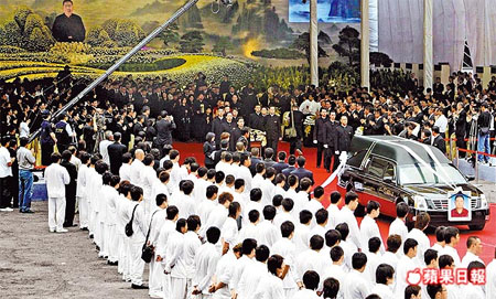 李照雄告别式会场占地165000平方米,逾20000人致祭,场面盛大,灵车在众人送行下,缓缓驶出会场。 来源:台湾《苹果日报》