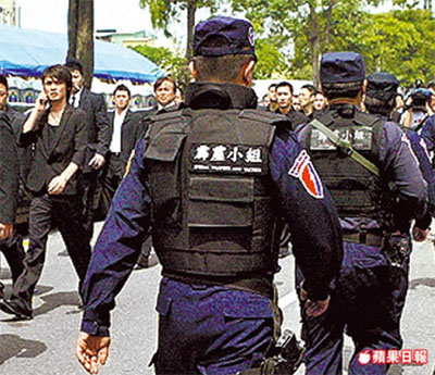 台警方小组持枪在现场巡逻,并加强盘查青少年。 来源:台湾《苹果日报》
