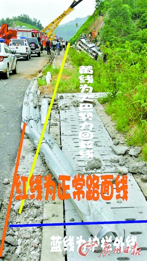 记者昨天上午10时赶到现场时,出事地点正巧在潮莞高速惠州段的两个山头的沟谷之间。由于未到沟谷前路面比跨谷桥段要宽半米,所以怀疑是大巴当时不小心太靠边行驶,开始撞上路边护栏后一路前冲想转回正常路面来,但在冲出十多米后车后轮已经掉出路基外近2米处,在陡峭路基上留下一道深深的后轮迹,一直冲到谷的另一边,车子才翻侧到路沟里。