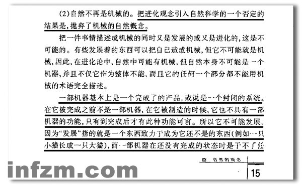 把一件事情描述成机器的同时又是发展的或又是进化的,这是不可能的。有些发展着的东西可以把自己造成机械,但它不可能就是机械,因此,在进化论中,自然中可能有机械,但自然本身不可能是一个机器,并且不仅它作为整体不能,而且它的任何一个部分都不能用机械的术语完全描述。