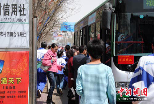 白银市民挤上公交车。自4月26日早晨起,白银市城区出租车陆续“停运”。经官方协调后,至28日,有少量出租车恢复营运,但对城市的交通出行而言仍是杯水车薪。侯志雄 摄