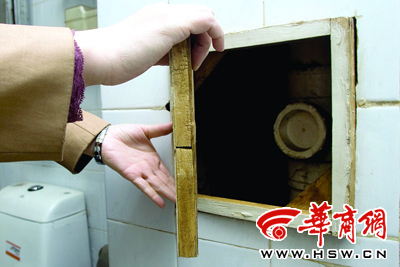 凌师傅说,排烟管道是在卫生间的西北角,这上面有一个面积很小的木门,叫做检查口,是为维修管道方便设置的,但这个检查口平时都是关闭不严实的,“密封性较差,这样一来,如果排烟管道内有一氧化碳,会从管道泄漏到卫生间。”