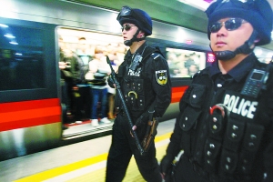 从4月初开始,本市特警在地铁东直门、北京站、王府井、天安门东站、天安门西站、前门、西单、军博等8个一级控制车站执行武装巡逻任务。每个巡逻警组由3名特警组成,装备了防暴枪、手铐等各种必要的警用器械,随时处置突发事件。