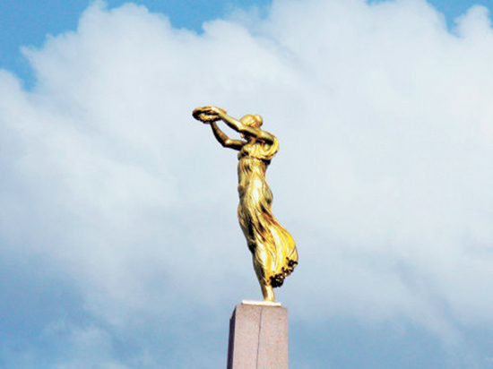 雕像展示的是身着战袍的少女,鸟瞰整个城市,微微欠身,呈献上手中的橄榄枝的情景。卢森堡人赋予了这尊雕像自由和抗争的象征意义。在卢森堡,“金色少女”站在宪法广场中央高耸的英雄纪念碑顶上。这座纪念碑于1923年完工,当时是为了纪念第一次世界大战中阵亡的3000名卢森堡士兵而建。1940年,英雄纪念碑遭纳粹推倒,在第二次世界大战后重建,因此具有了双重的纪念意义,被视为卢森堡国宝和国家的象征。(张兵)