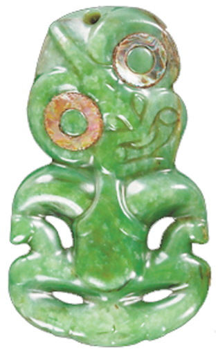 此外,新西兰奥塔哥博物馆也向上海世博会选送了珍贵玉器“酋长宝玉”。它来自毛利人三大部落之一“启大湖”,是当地部落酋长代代相传的玉挂坠。这一传世珍宝高16厘米,宽9.6厘米。毛利部落的能工巧匠用鲍鱼贝壳制作双眼,雕琢出一个盘腿而坐的毛利人肖像。肖像头微翘,若有所思的神态惟妙惟肖。