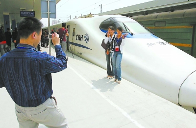 乘客们非常喜欢和谐号列车的车头造型,纷纷和它合影。关建东 摄